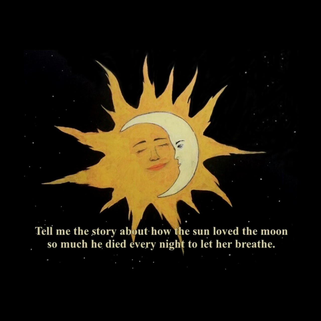 The moon princess sat by herself, in gloom, hoping for something to finally change this state of hers when suddenly - sunbeams started to pierce through the clouds in front of her, thinning them out but still not enough for her to fully see yet. With her vision now slightly hazy she attempts to look up and is met with tiny little stars glistening right before her eyes. Out of nowhere tears silently start rolling down her cheeks as she is overcome with a sudden and inscrutable familiarness and so she follows her instincts, gently holds them between her palms and brings them close to her heart, engulfing them in a hug. Her sobs begin to become more audible and her heart gets filled with a feeling of serenity, but is still stinging, for the longing seems to shrink while she feels like she has found what she's been wishing for all this time, but as though something is still absent.